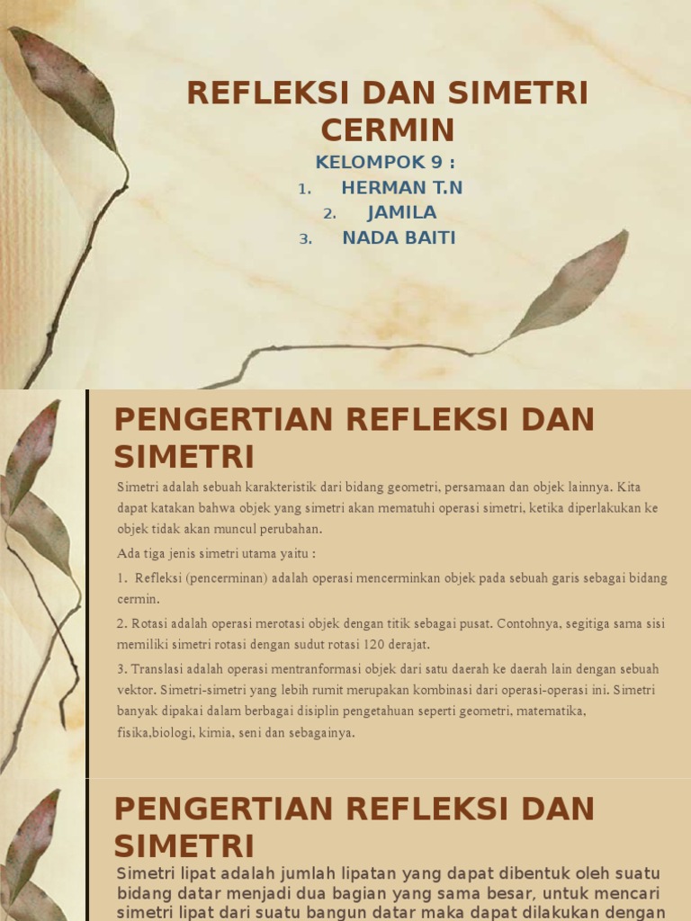 Anda perlu mengkonversi dan men-download sekurangnya 1 file untuk memberi masukan. Meskipun terdapat banyak jenis simetri Berikut ini ada dua simetri paling umum yang akan Anda lihat. Bidang pemisah dapat juga dianggap sebagai cermin datar dan bagian yang satu merupakan bayangan cermin bagian.